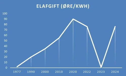 Siden 1977 er elafgiften steget fra 2 øre til ca.72 øre/kWh + moms – det svarer til hele 3500 %. Den kortvarige sænkning i 2023 var en undtagelse som følge af Energikrisen – men nu er vi tilbage på højt niveau.